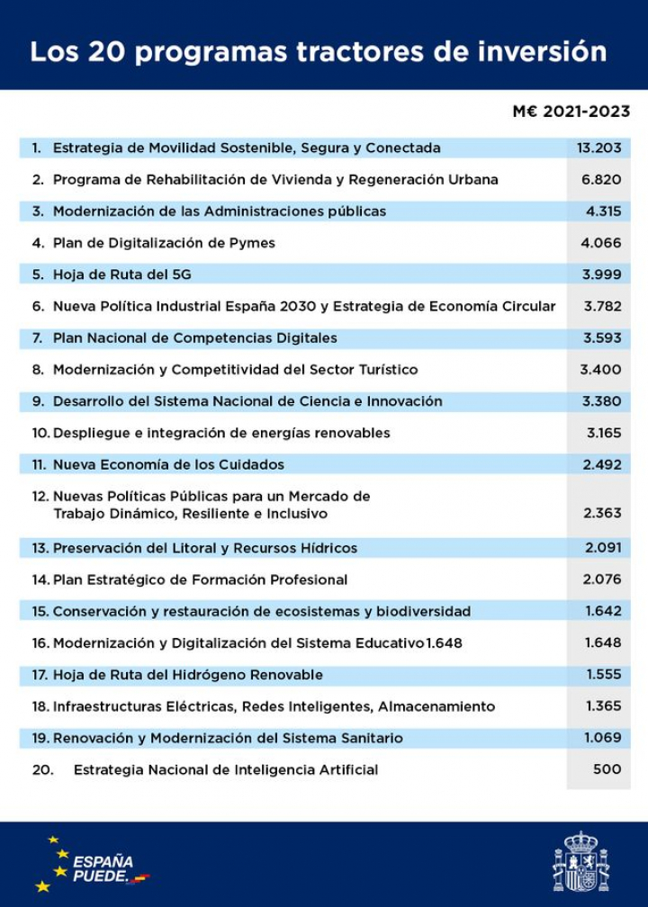 Sánchez ha explicado que el plan contempla 20 inversiones principales, a las que ha denominado “programas tractores de inversión”. Estos recibirán esos 70.000 millones de euros hasta 2023.