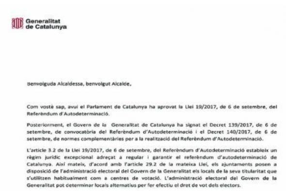 También recuerdan que ahora hay un "régimen jurídico excepcional dirigido a regular y garantizar el referéndum" y que los cargos públicos deben cumplirlo, aunque detallan que el Govern quiere utilizar todos los locales que fueron puntos de votación en las elecciones al Parlament del 27 de septiembre de 2015, las últimas autonómicas.