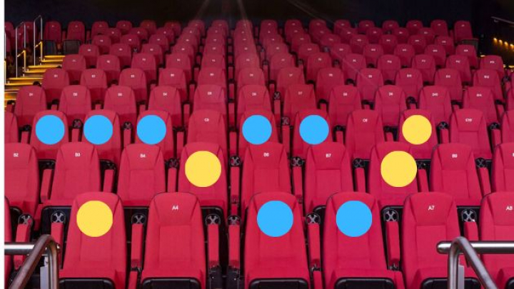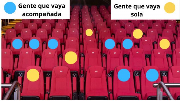 Así sería, previsiblemente, la asignación de asientos en cuanto reabran los cines. Las personas que vayan acompañados podrán sentarse juntos, estarán separados del resto por una o dos butacas y, en cuanto a las filas, se ocuparán los asientos en diagonal, es decir, no habrá nadie sentado delante y tampoco detrás: