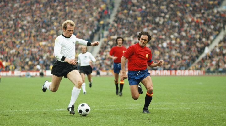 Esta camiseta, más rudimentaria y sin ni siquiera una firma deportiva detrás se mantuvo hasta los años 70 cuando nombres como Santillana, Gordillo o Amancio lucían una elástica, algo más deportiva, pero igualmente básica: camiseta roja, pantalón azul y medias negras o azul marino con la bandera de España.