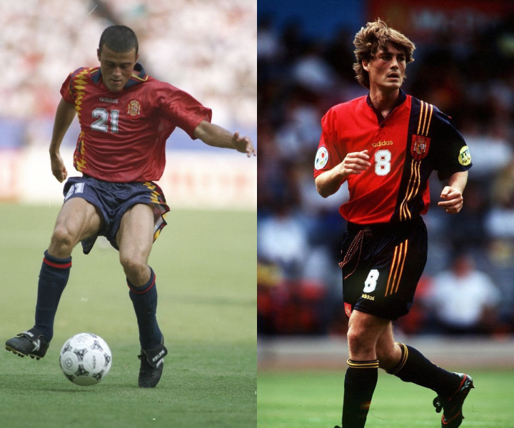 Cabe destacar de estos años los diseños del Mundial del 94, con los característicos rombos que lucían ese año todas las selecciones que tenían equipaciones Adidas —sí, se trata de la elástica que lució Luis Enrique cuando recibió el codazo de Tassotti, en este caso la segunda, en blanco—; y la de la Eurocopa de 1996, con una manga azul y los ribetes sobre el escudo en el lado derecho.