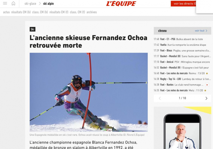 L’Équipe es un diario francés de información deportiva, especialmente de fútbol, que ha titulado la noticia muy parecido al resto: “Encontrada muerta la exesquiadora Blanca Fernández Ochoa”.