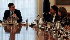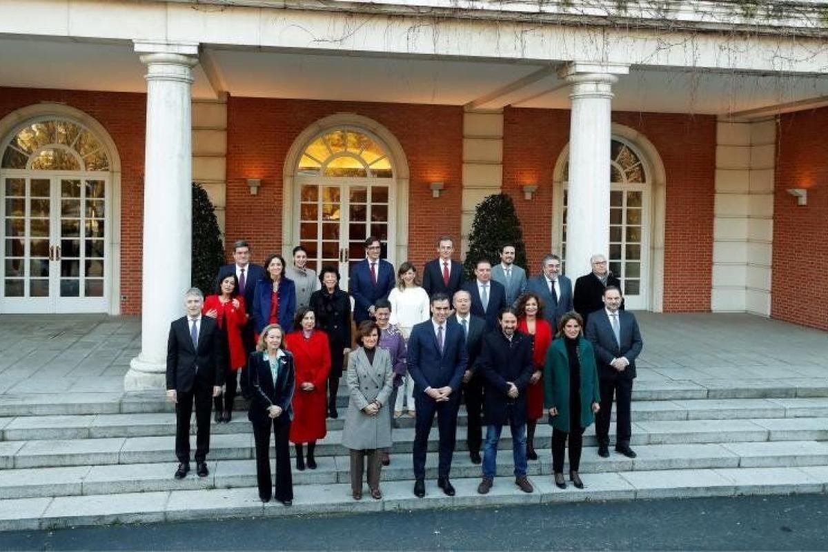 En la foto Sánchez está flanqueado a su derecha por las vicepresidentas primera y tercera, Carmen Calvo y Nadia Calviño, respectivamente, mientras que a la izquierda se han situado los vicepresidentes segundo y cuarto, Pablo Iglesias y Teresa Ribera.