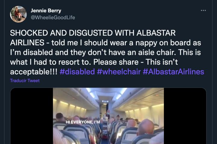 En el tuit, además, la viajera asegura que un responsable de la aerolínea le indicó que se pusiera un pañal debido a que no tienen una silla de ruedas que queda por el pasillo del avión y, por lo tanto, no podría cruzar el pasillo sola.