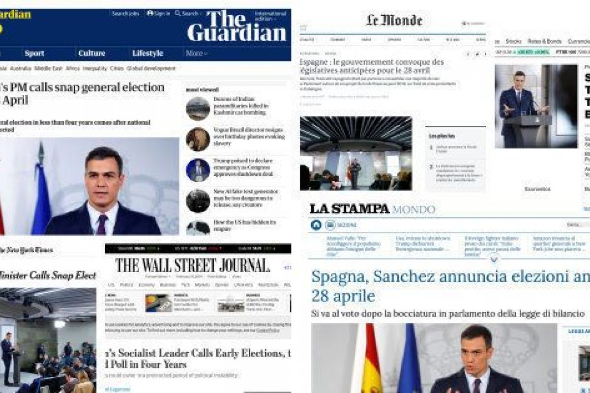 Si el batacazo en la aprobación de los presupuestos, el pasado miércoles, ya hizo que la prensa internacional empezase tibiamente a fijarse en los tambores electorales que sonaban en España, la confirmación de que habrá que ir a las urnas el 28 de abril se ha colado directamente en los diarios, radios y televisiones de todo el mundo.
