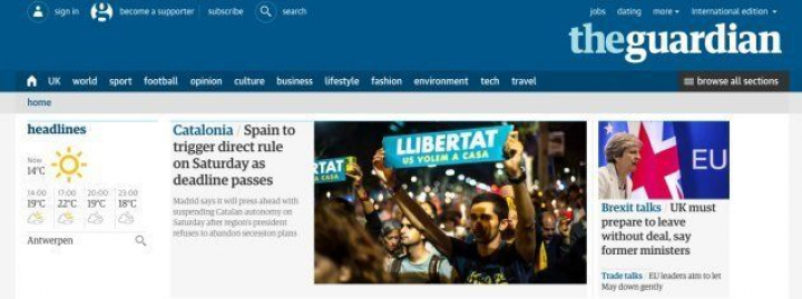 El británico The Guardian destaca que el Ejecutivo central apuesta por el control autonómico ante el fin del plazo dado a Govern. "Madrid dice que seguirá adelante con la suspensión de la autonomía catalana el sábado, después de que el presidente de la región se niegue a abandonar los planes de secesión", añade. Su corresponsal destaca que es una medida "sin precedentes". La noticia -apertura en su web- la ilustra con una imagen de los manifestantes a favor de la libertad de los Jordis, de hace dos días.