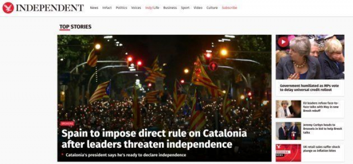 En el mismo país, The Independent habla de que Rajoy va a "imponer" la norma para tomar las riendas de Cataluña, "retirando su derecho de autogobierno". Su corresponsal recuerda que nunca en democracia se ha tenido que optar por esta salida del 155. "Los catalanes han descrito previamente la imposición del gobierno directo como una "invasión" del autogobierno de la región, mientras que las autoridades centrales españolas lo retratan como un movimiento no deseado, aunque necesario, para restablecer la legalidad después de que el gobierno de Puigdemont prosiguiera con un referéndum prohibido violó la constitución del país", narra en su noticia, que abre su edición nacional acaparando casi toda la pantalla.
