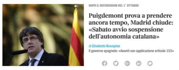 En Italia, donde los medios han mostrado un interés extremo por esta crisis, el Corriere della Sera titula: Puigdemont trata de ganar tiempo, pero Madrid se cierra: "El sábado se suspenderá la autonomía catalana". Su información, en esta ocasión, no pasa de mitad de la página, porque manda un tema propio, en exclusiva, sobre corrupción local.