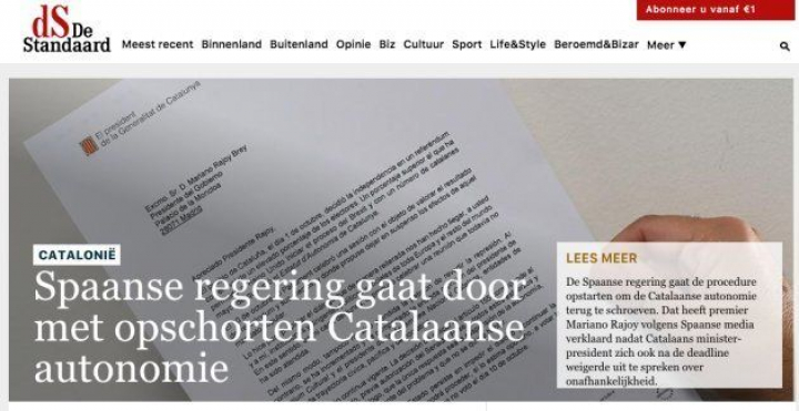 De Standaard, diario igualmente belga pero de la zona flamenca, con alto componente nacionalista e independentista, dice que el Ejecutivo "avanza en la suspensión de la autonomía" catalana, explica que si eso ocurre Puigdemont irá a la independencia y destaca una noticia en la que insiste, como lleva haciendo semanas, en sus reproches a España por "violencia policial" y por hacer "ido demasiado lejos".