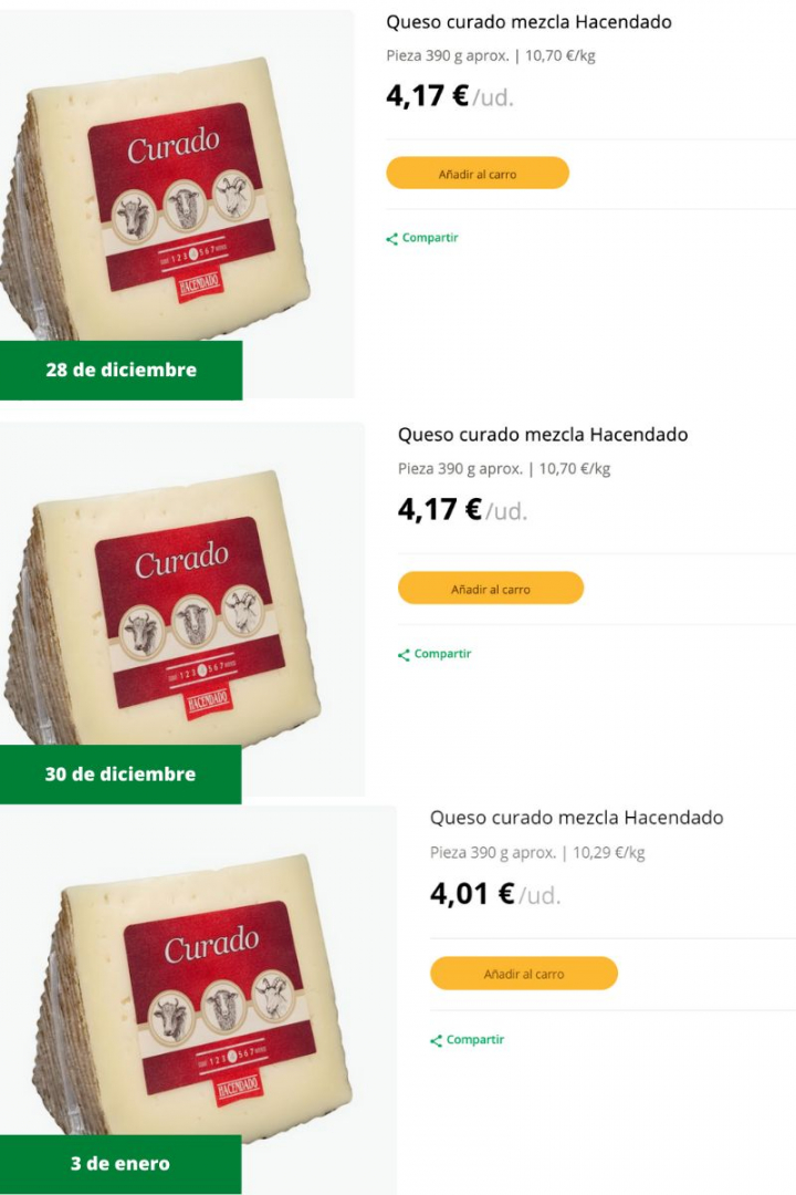 También el queso curado mezcla Hacendado: tenía un precio de 4,17 euros los días 28 y 30 de diciembre, y el 3 de enero, de 4,01 —0,16 euros menos—.