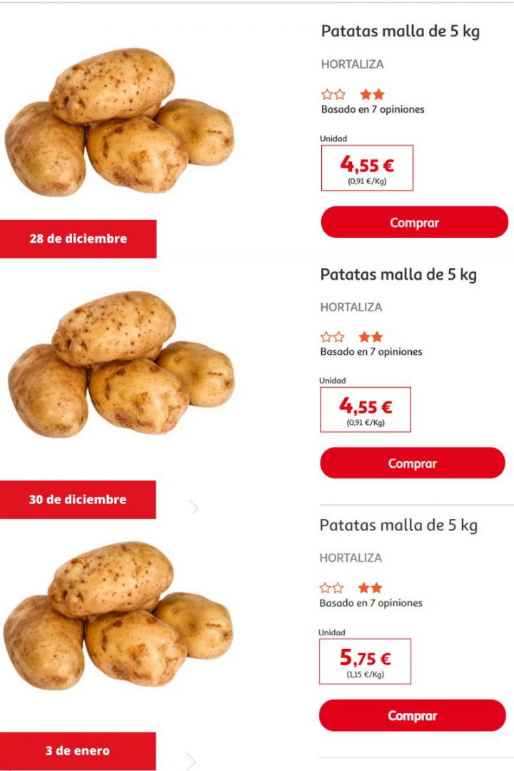 A fecha del 3 de enero también estaba disponible otra oferta que reduce de forma notable el precio de las patatas, en concreto de una malla de cuatro kilos que se mantuvo a 5,99 euros durante la última semana del año y que ahora cuesta 4,99, un euro de ahorro.