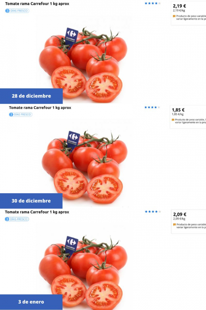 Llama especialmente la atención la variación de precios del tomate, particularmente, de la malla de un kilo de tomates de rama. A día 3 de enero cuesta 2,09 euros, menos que el 28 de enero, cuando se podía comprar por 2,19, pero más que el día 30 de diciembre, cuando el precio descendió hasta los 1,86 euros. Esto puede explicarse porque el kilo de tomates no siempre es exacto y desde la web de Carrefour ya advierten de que los precios que aparecen en la web son aproximados y pueden ser diferentes a los que termina pagando el cliente.