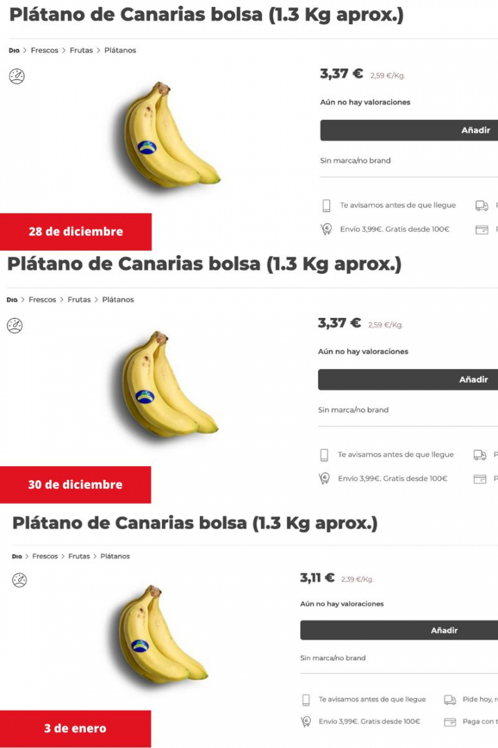 Al igual que en Mercadona, hay excepciones de productos que han incrementado su precio. El plátano de Canarias en este supermercado también ha sumado ocho céntimos, después de una bajada de diez entre el 28 y el 30 de diciembre, manteniendo solo una diferencia de dos céntimos entre el primer día de medición y el 3 de enero.