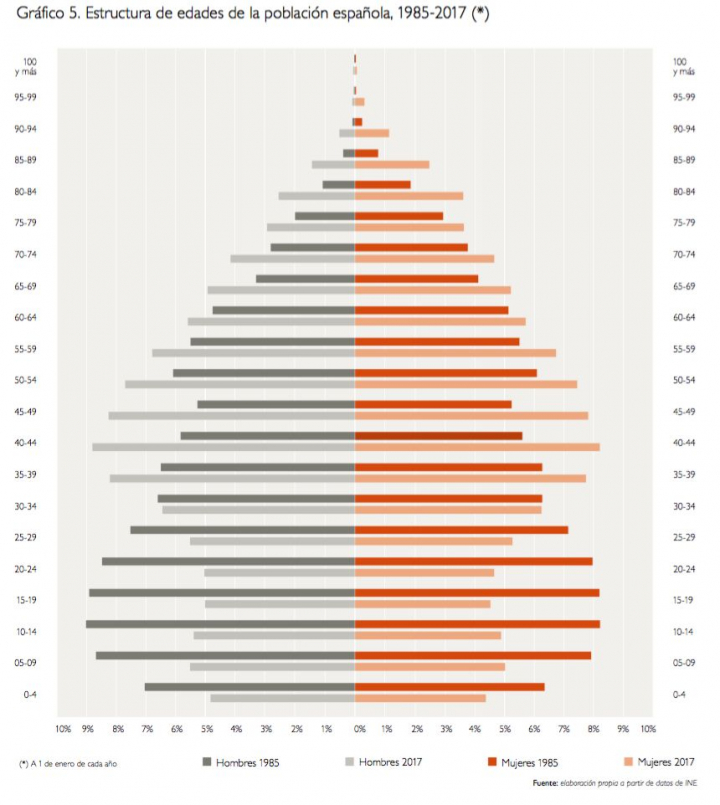 El incremento de la longevidad y la menguante natalidad está teniendo consecuencias en la estructura de la población. Las conocidas pirámides de población están evolucionando para convertirse en pilares o rectángulos. La edad media de la población ha pasado de los 34 años en 1985 a los 48 años en 2017. "Todos los países están evolucionando en la misma dirección", apunta Herce.