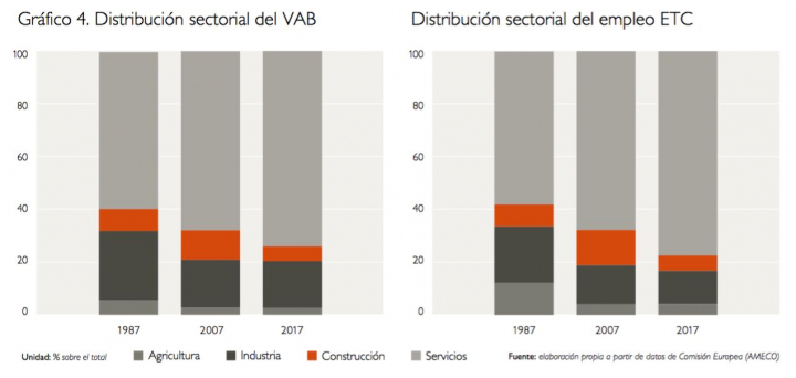 Estos expertos señalan que es algo que no es exclusivo de la economía española, sino que "responde a una dinámica global", en la que se produce una reducción progresiva de la importancia de los sectores primario (agricultura) y secundario (industria), que también se refleja en el empleo. "El sector servicios concentra el 78% del empleo en la actualidad frente al 58% de hace 30 años", afirman.