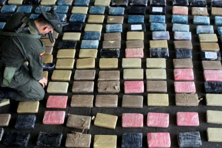 Un agente antinarcóticos de Colombia coloca la cocaína intervenida en el puerto de Buenaventura en marzo de 2009.John Vizcaino / Reuters