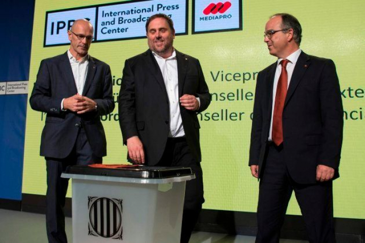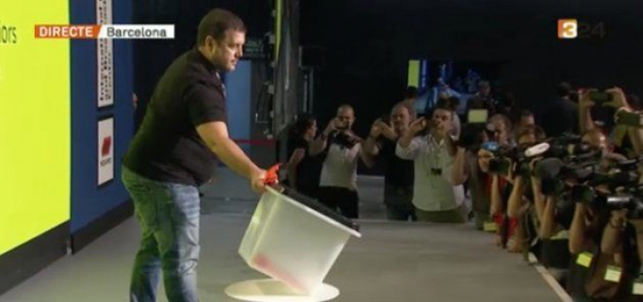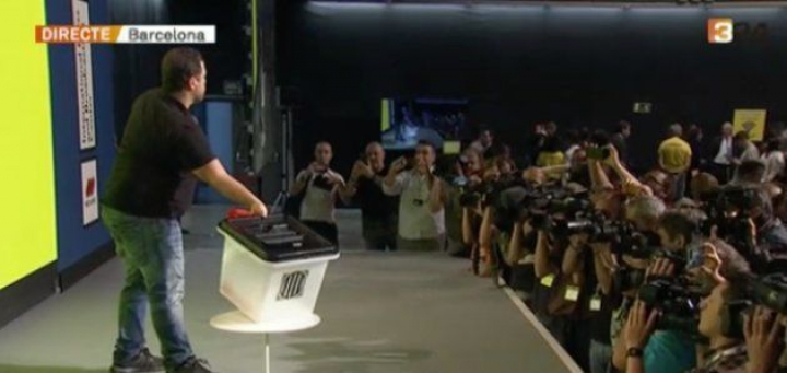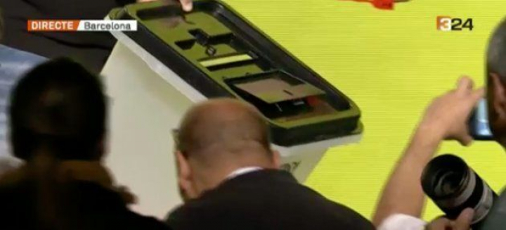 Al final de la rueda de prensa en la que los responsables de la Generalitat han explicado el dispositivo de cara a la consulta, un empleado ha mostrado un ejemplar de urna.