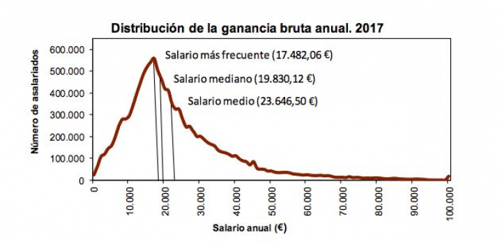 Por eso, conviene fijarse más en otros valores. El sueldo más frecuente –aquel que cobraron un mayor número de trabajadores— se situó en 17.482,06 euros, un 6% más que el año anterior. Si se divide en 14 pagas, el salario mensual sería 1.248,71 euros brutos.