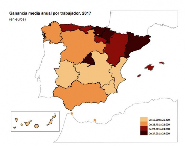 Los salarios más elevados correspondieron a Euskadi (28.204,49 euros anuales por trabajador), Madrid (27.089,12 euros) y Navarra (26.329,79 euros). Los más bajos en Extremadura (19.672,40 euros), Canarias (20.185,33 euros) y Castilla-La Mancha (21.033,33).