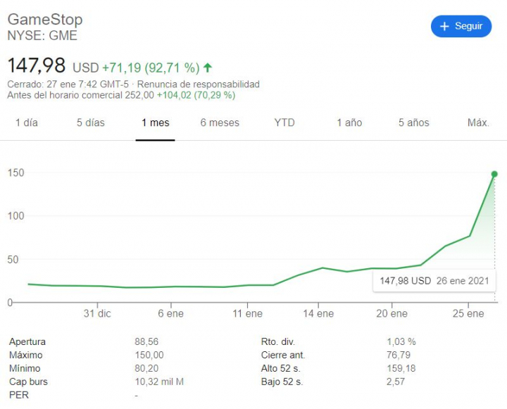 El troleo de estos internautas ha resultado todo un éxito. Si las acciones de GameStop valían 17 dólares a principios de año, este martes se han situado cerca de los 148 euros. La revalorización ha sido superior al 700% en lo que va de año. Solo el martes subieron un 93%.