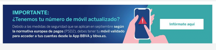Los 4,5 millones de clientes digitales de BBVA también han empezado a notar las novedades al operar a través de la web. Un mensaje de alerta aparecía en las últimas semanas nada más entrar: “A partir de septiembre tu [número de] móvil será imprescindible para acceder a bbva.es y a la aplicación. Utilizaremos este móvil **** para la verificación”.