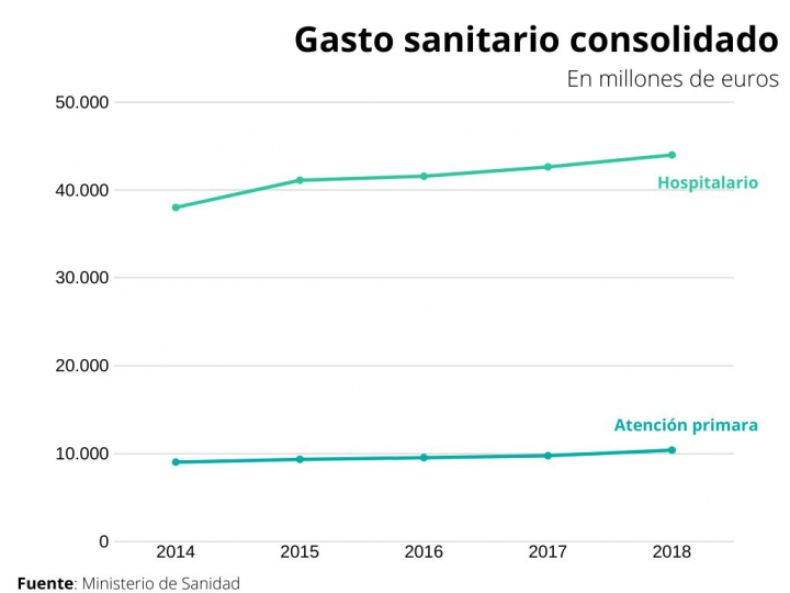 Los datos del ministerio reflejan que desde el 2014 el montante directo a los hospitales ha pasado de 38.007 millones a 43.978 en cuatro años. La cantidad supone casi 6.000 millones más respecto a la subida de 1.363 que experimentó la atención primaria, donde el total de gasto ha pasado de 9.024 en 2014 a 10.387 en 2018.