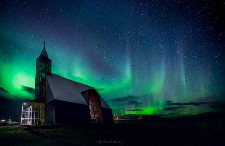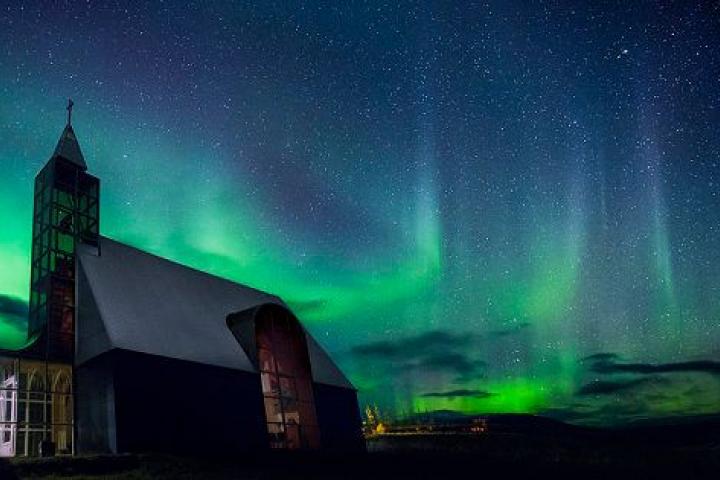 Este templo de nombre impronunciable es una de las iglesias más jóvenes de Islandia. Fue construida por un agricultor en honor a su difunta esposa en 2006 y, por su estructura y su moderna cristalera, no se parece en absoluto a ningún otro templo de la zona. Observar una aurora boreal desde aquí es toda una experiencia.