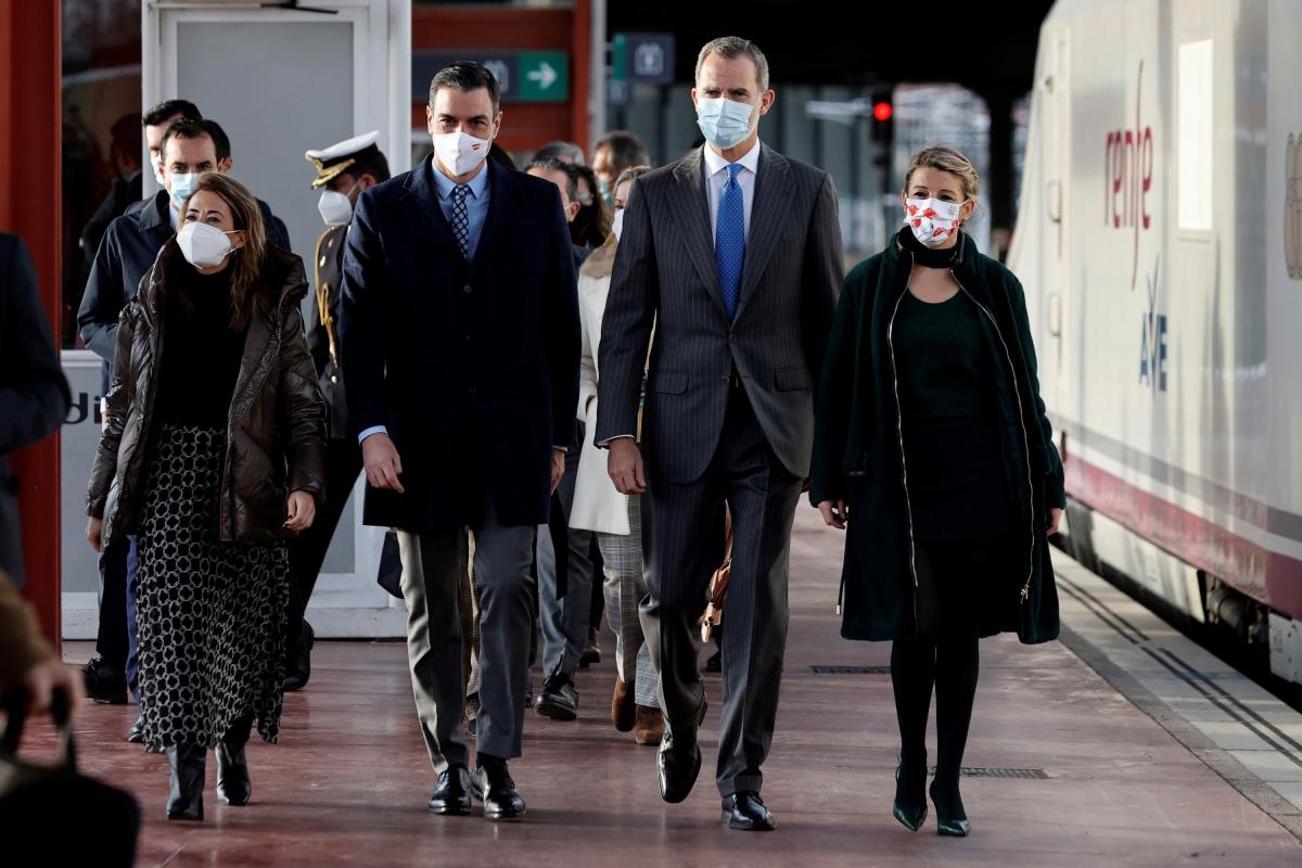 El rey y Sánchez han montado en el nuevo AVE en la estación de Chamartín a las 9.45 horas para emprender viaje a la capital orensana junto a la vicepresidenta segunda y ministra de Trabajo, Yolanda Díaz, y la de Transportes, Raquel Sánchez.
