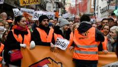 Este domingo, unas 1.500 personas afectadas por el problema de la línea 7B de Metro en San Fernando se manifestaron por el centro de Madrid para pedir el realojo de las familias al grito de “Metro culpable, Ayuso responsable”.