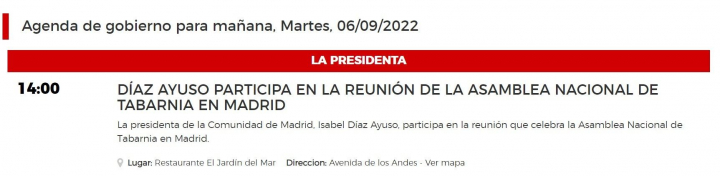 La agenda de Isabel Díaz Ayuso para este martes tiene un único acto público, pero no es un acto cualquiera y ha llamado la atención de las redes sociales. En concreto, la presidenta de la Comunidad de Madrid participa en la reunión que celebra la Asamblea Nacional de Tabarnia en Madrid.
