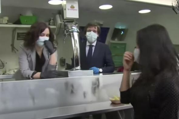 Tras hablar con uno de los empleados del puesto, Ayuso y Almeida han accedido a su interior y han posado tras la barra, junto al grifo de cerveza, como si fueran a ponerse a repartir bocatas. Algo que finalmente la presidenta madrileña ha hecho con la vicealcaldesa de Madrid, Begoña Villacís, también presente en el acto.