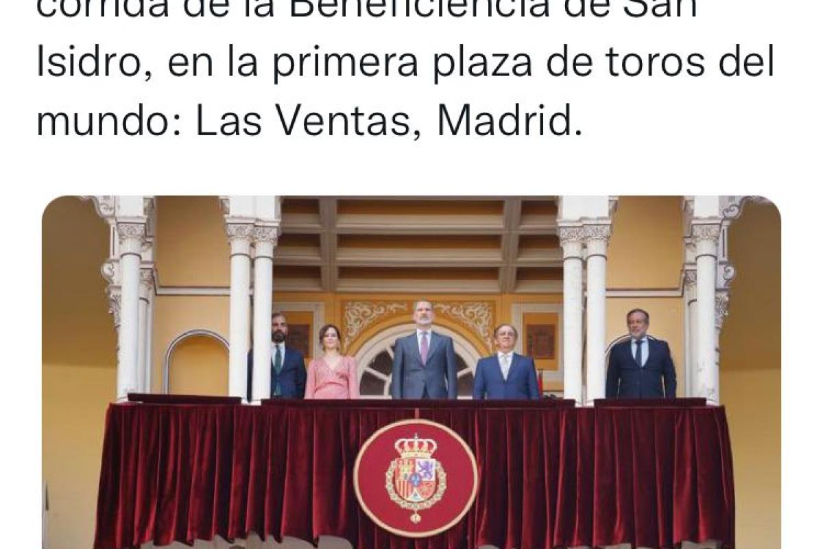 “El Rey de España presidiendo la corrida de la Beneficiencia de San Isidro, en la primera plaza de toros del mundo: Las Ventas, Madrid”, escribió la dirigente del PP.