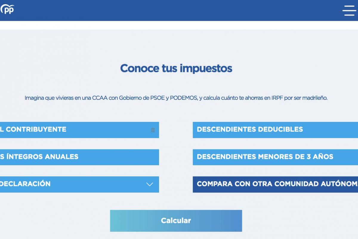 La calculadora consiste en rellenar seis campos: edad, ingresos íntegros anuales, tipo de declaración, descendientes deducibles, descendientes menores de 3 años y una comunidad gobernada por PSOE y Podemos a comparar.