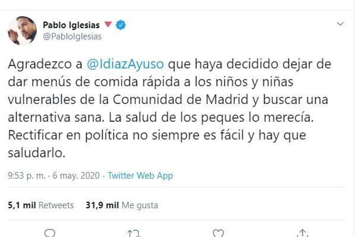 Según ha informado el Gobierno regional, la Consejería de Educación ya llevaba tiempo preparando alternativas a estos menús. Tras conocerse el fin de esta medida, Pablo Iglesias, vicepresidente del Gobierno, ha publicado un amable tuit en el que agradecía a Díaz Ayuso su decisión de dejar de dar a los niños menús de comida rápida y buscar una alternativa sana.