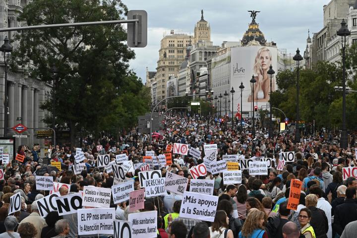 Varios miles de personas se manifiestan esta tarde en el centro de Madrid para exigir a la Comunidad de Madrid más recursos para el sistema público de salud, la mejora de las condiciones laborales de los profesionales y el aumento de la financiación, en una protesta organizada por veintiséis organizaciones sindicales y ciudadanas.