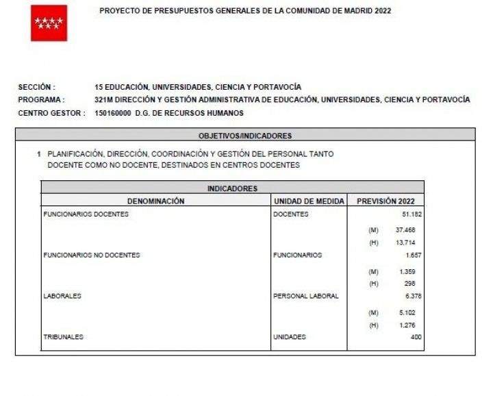 En su argumentario, Galvin detalla una serie de aspectos que alejan las cifras de Ayuso de la realidad. En primer lugar, menciona los presupuestos de la comunidad para este año donde se indican 51.182 funcionarios docentes en la previsión para 2022.