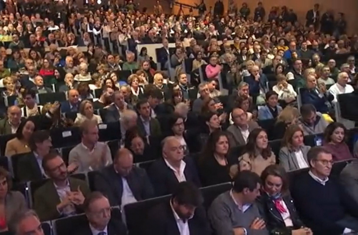 Pero, tras ello, la cámara ha enfocado al auditorio y, entre los aplausos de algunos de los asistentes, se ha podido ver a algunos dirigentes del PP, incluido Feijóo, con cara de póker y sin aplaudir las palabras de la dirigente madrileña.