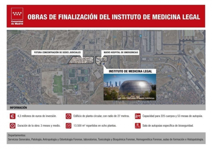 El Instituto de Medicina Legal es el único edificio construido de los 15 previstos del Campus de la Justicia, un faraónico proyecto urbanístico ideado en 2004 por la expresidenta madrileña Esperanza Aguirre para unificar en un solo complejo todas las sedes judiciales de la región.