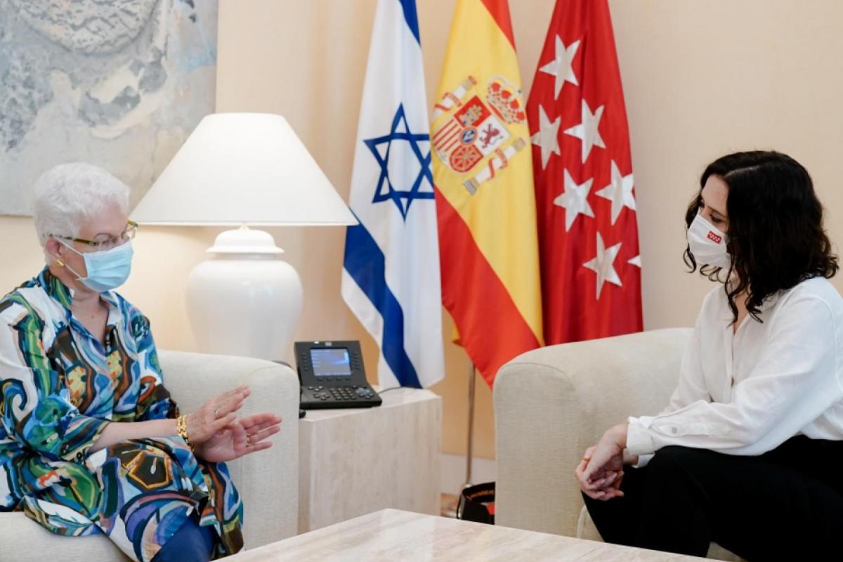 Ayuso ha recibido esta mañana en su despacho de la Puerta del Sol a la embajadora de Israel, Rodica Radian-Gordon, ante la que se ha comprometido a colaborar para erradicar el antisemitismo y seguir trabajando conjuntamente para estrechar lazos económicos y comerciales entre la región y el país de Medio Oriente.
