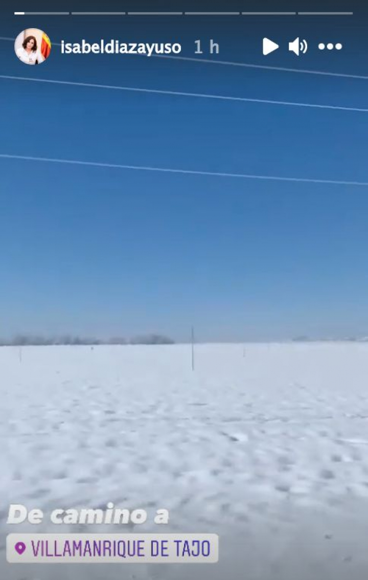 Lo ha querido compartir en una serie de stories en su cuenta de Instagram. “Esto que parece una estepa siberiana es Villamanrique de Tajo, sureste de Madrid”, narra la propia presidenta en un pequeño vídeo en el que se ve un campo completamente nevado.