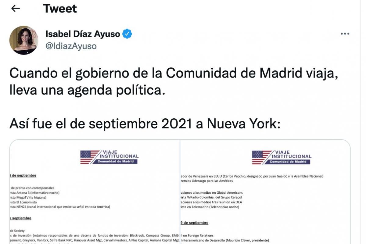 Ayuso publica su agenda de cuando estuvo en Nueva York y recibe el mismo tuit decenas de veces