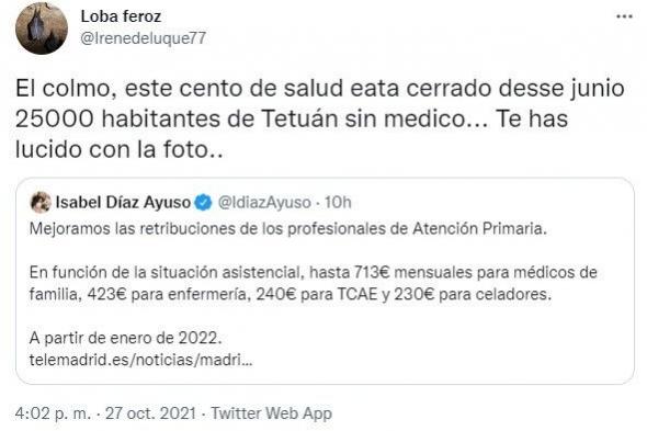 Aún así, este miércoles, tras la presentación de los presupuestos para 2022, Ayuso ha anunciado la mayor rebaja fiscal y la mejora de las retribuciones a los profesionales de la Atención Primaria a partir de enero. “En función de la situación asistencial, hasta 713 euros mensuales para médicos de familia, 423 euros para enfermería, 240 euros para TCAE y 230 euros para celadores”, ha detallado en una publicación en la que compartía orgullosa el artículo de Telemadrid que aplaudía la noticia.