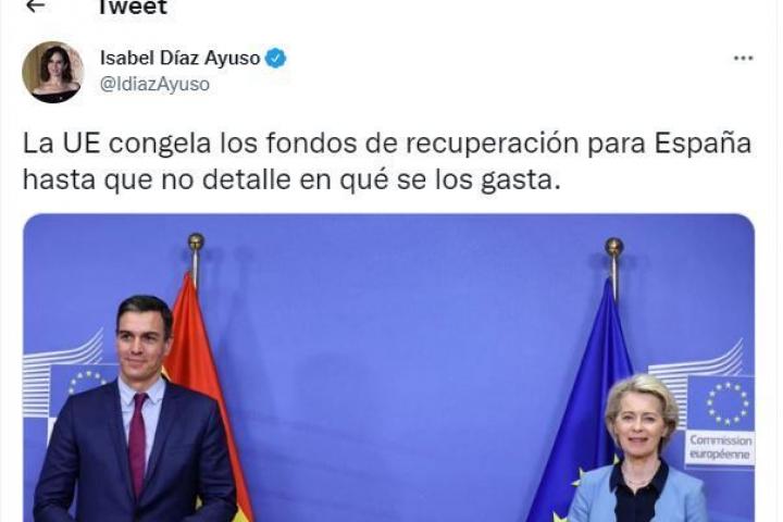 La presidenta de la Comunidad de Madrid, Isabel Díaz Ayuso, ha asegurado en Twitter que no va a borrar su tuit más polémico de los últimos días, que tuvo que desmentir posteriormente Bruselas y en el que aseguraba que la UE había congelado los fondos de recuperación para España.