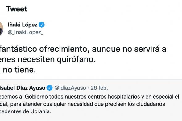 Una de las dirigentes que ofreció ayuda en Twitter fue la presidenta de la Comunidad de Madrid. Ayuso puso un tuit donde ponía a disposición del gobierno las instalaciones del hospital de pandemias Isabel Zendal “para atender cualquier necesidad que precisen los ciudadanos procedentes de Ucrania”.