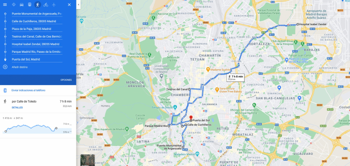Porque esa es la distancia que hay en el recorrido que muestra la grabación, que parte del Puente Monumental de Arganzuela y recorre lugares emblemáticos de Madrid como la calle Cuchilleros, en pleno centro, y los Teatros del Canal, en el barrio de Chamberí.