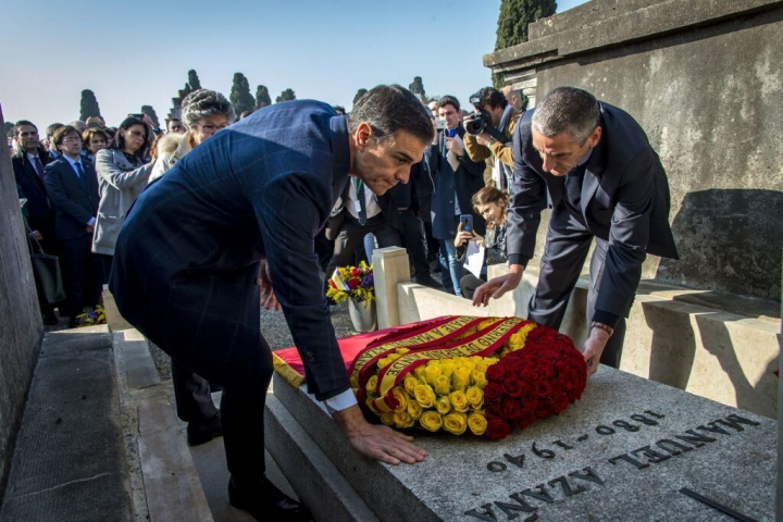 Azaña, nacido en Alcalá de Henares en 1880, descansa en el cementerio de Montauban, el pueblo francés donde murió, exiliado, en 1940. Hasta allí desfiló el presidente del Gobierno, Pedro Sánchez, quien ha presidido el homenaje en el Congreso a su figura —al que han asistido todos los partidos salvo Vox— , para dejar una corona de flores rojigualdas.
