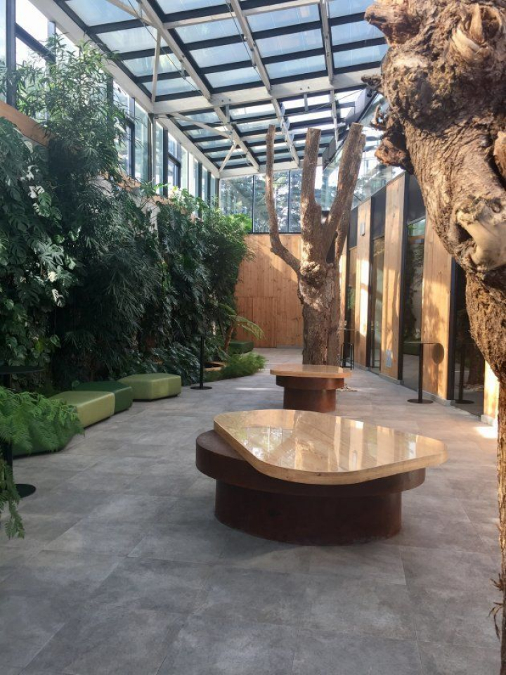 Visitada la cocina toca el invernadero que ocupa una esquina de la caja de cristal, caja dentro de la caja, cuajada de hierbas y flores. Una belleza entre la naturaleza y la arquitectura, una fiesta de colores y aromas, empezando por una planta de la que surgen brumas y que nos dan a oler.