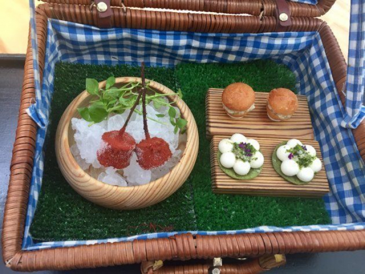 Plantas por todas partes y chorros de luz que inundan e iluminan los aperitivos de un bello picnic compuesto por el dorado y aromático txakolí de la casa, una intensa tartaleta de Idiazábal de Echano que es pura esencia de queso, un brioche de anguila ahumada y emulsión de anchoas tierno y también potente y una muy refrescante piruleta de tomate que esconde la punzante sorpresa de un toque de pimentón picante.