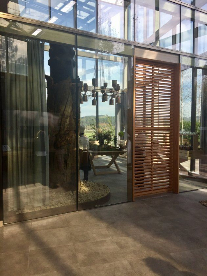 Hay muchos lugares en Azurmendi y se empieza por un pasillo de enorme altura en las traseras del comedor.