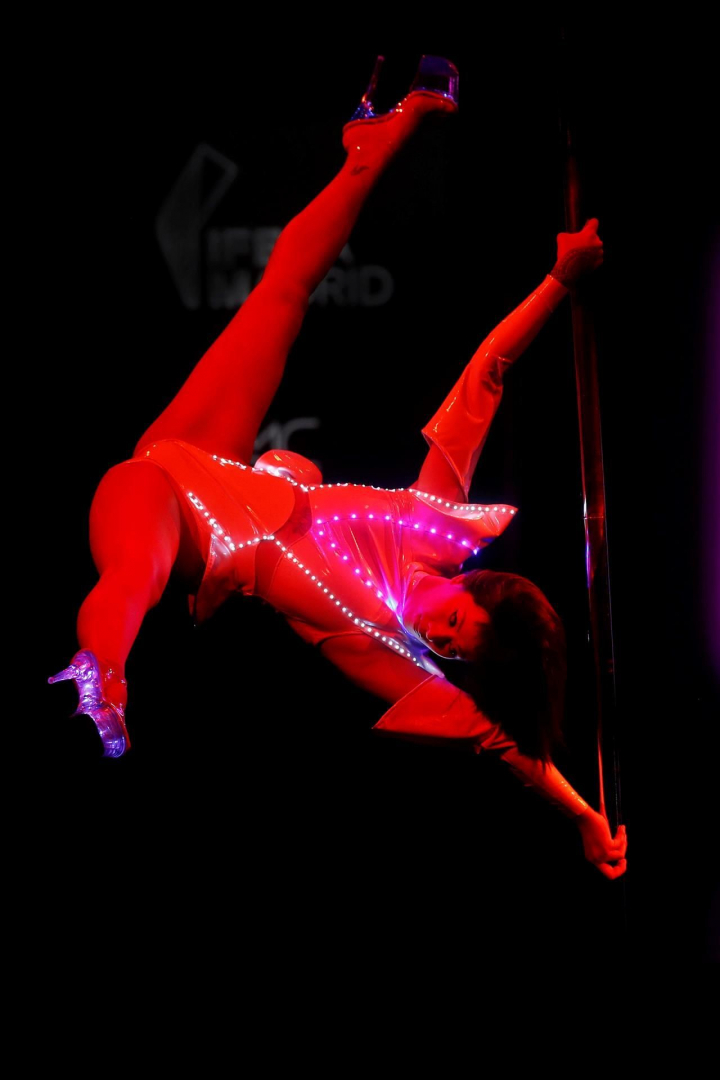 Haciendo un puente entre las dos partes de la colección, la firma contó con la presencia de la bailarina Mao Xue, que se subió a una barra de pole dance para hacer una performance, ataviada con un traje con luces.